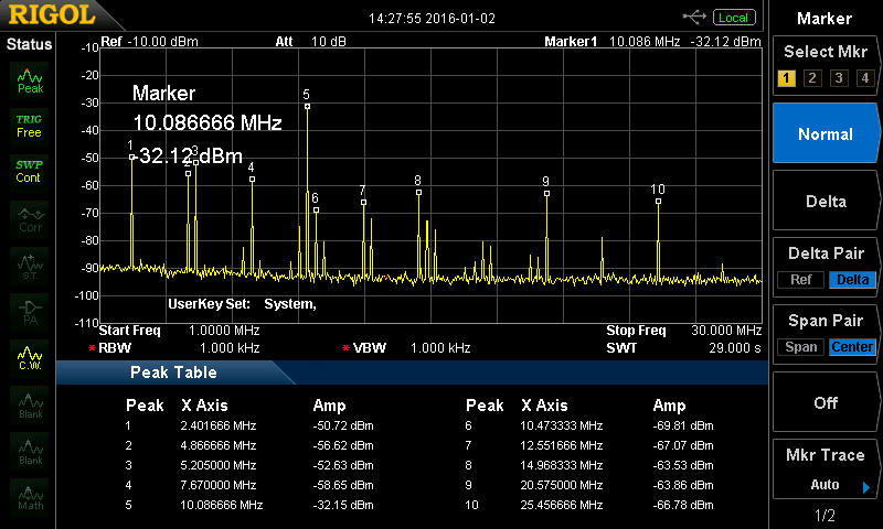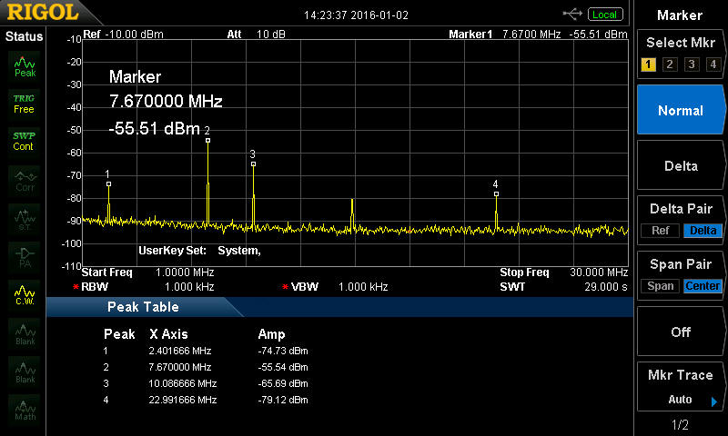 Now we are looking at the transmit mixer pin 6 which is the crystal oscillator at about 7.68 MHz, indicated as Peak 2. What is that other stuff? Well Peak 1 at 2.4 MHz is some bleed through of the VFO. Peak 3 is somewhat near what we expect for the mixed output, but maybe not close enough to be that. Although the frequencies are displayed to many decimal places their accuracy is not know. Peak 4 is probably the 3rd harmonic of the oscillator frequency.