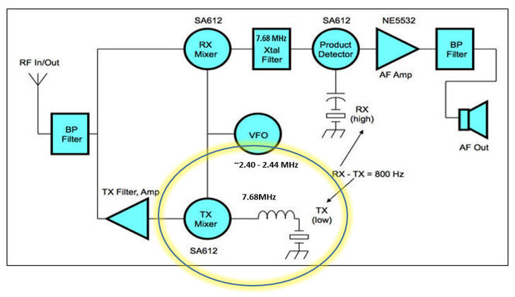 The SW-30+ radio employs three of these chips: one to heterodyne the incoming small-signal (10.1 MHz.) RF down to the I.F. frequency of 7.68 Mhz., another to heterodyne that down to audio, and another to heterodyne the VFO frequency of 2.4 MHz. up to 10.1 MHz. for the transmitting amplifier.