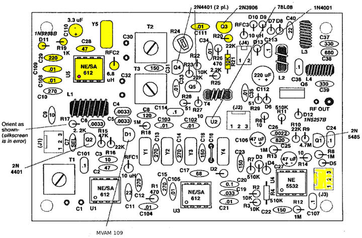 I completed this step and applied power, the voltage readings at pin 8of U5 were as expected for pins 1&3 jumpered or not on J3. But I did not hear a signal around 10.1 MHz as expected. I tuned my receiver to 7.68 MHz to hear the crystal oscillator and nothing.