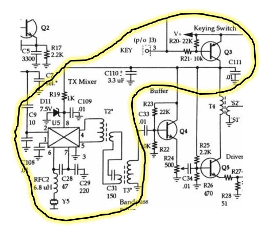 The “Keying” part of this step in assembly, Q3 and associated components (take a look at the schematic), is part of the rig that handles changing between transmit and receive. Pressing down on the key causes Q3 to conduct, supplying 12 volts to most of the transmitter components (the final amplifier gets power all the time). Pin 8 of U1 is a convenient place to observe the switching.